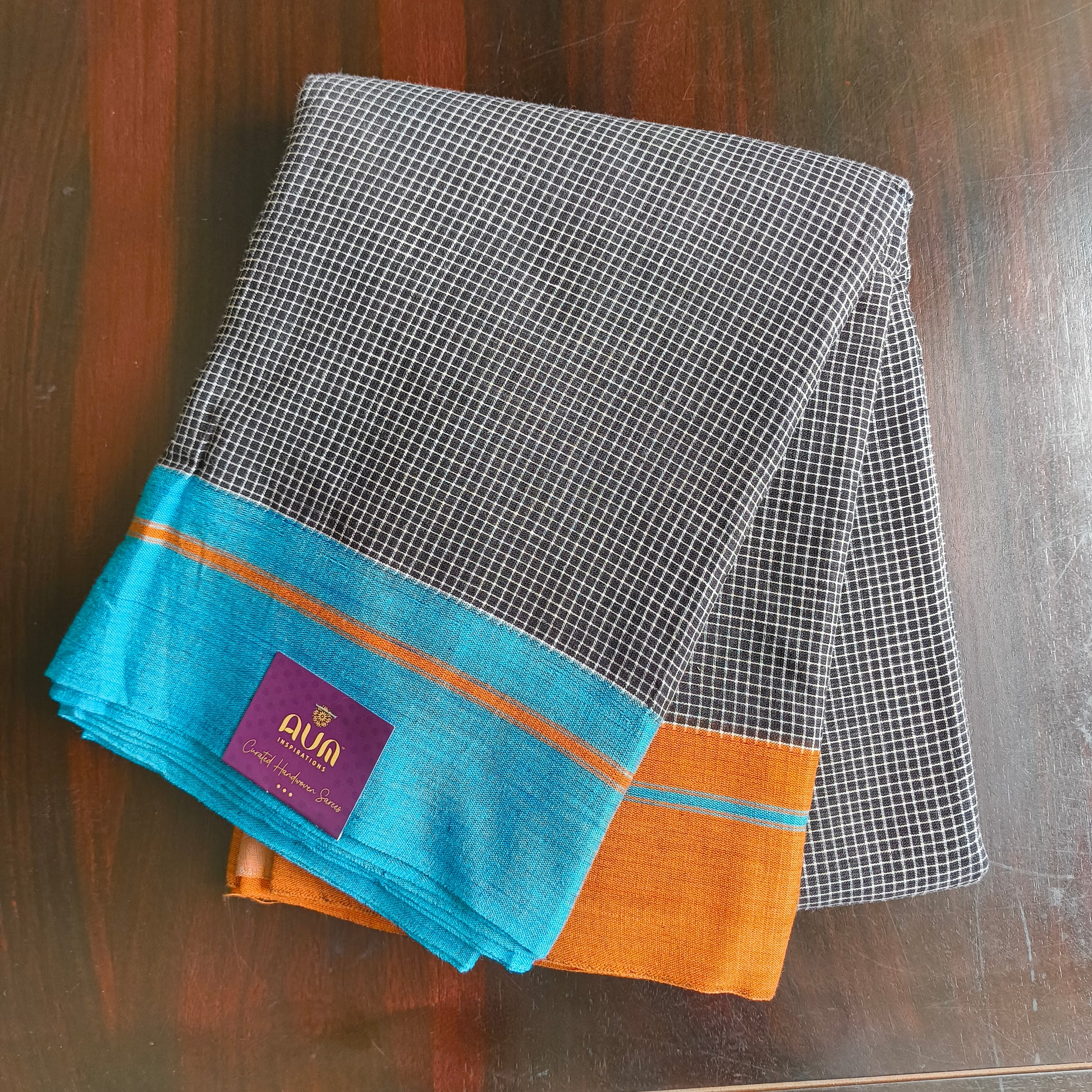 The Classic Black Patteda Anchu Saree with fine white checks all over the body has a splash of colours! The sky blue and orange borders make a beautiful contrast for the saree. These are the perfect gifts to younger ones looking for something traditional and chic!